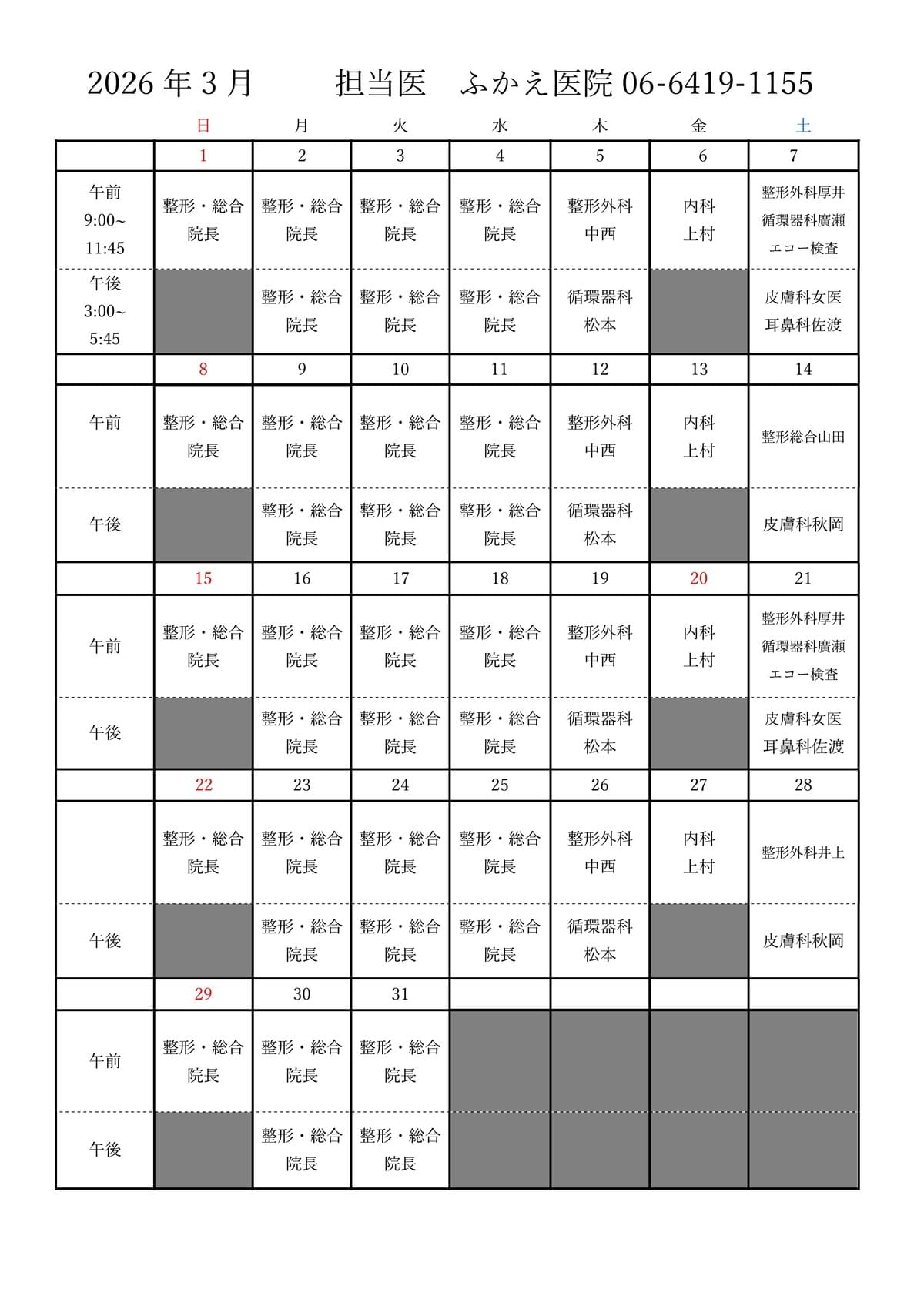 ※皮ふ科、耳鼻咽喉科の休診日はHPでご確認ください