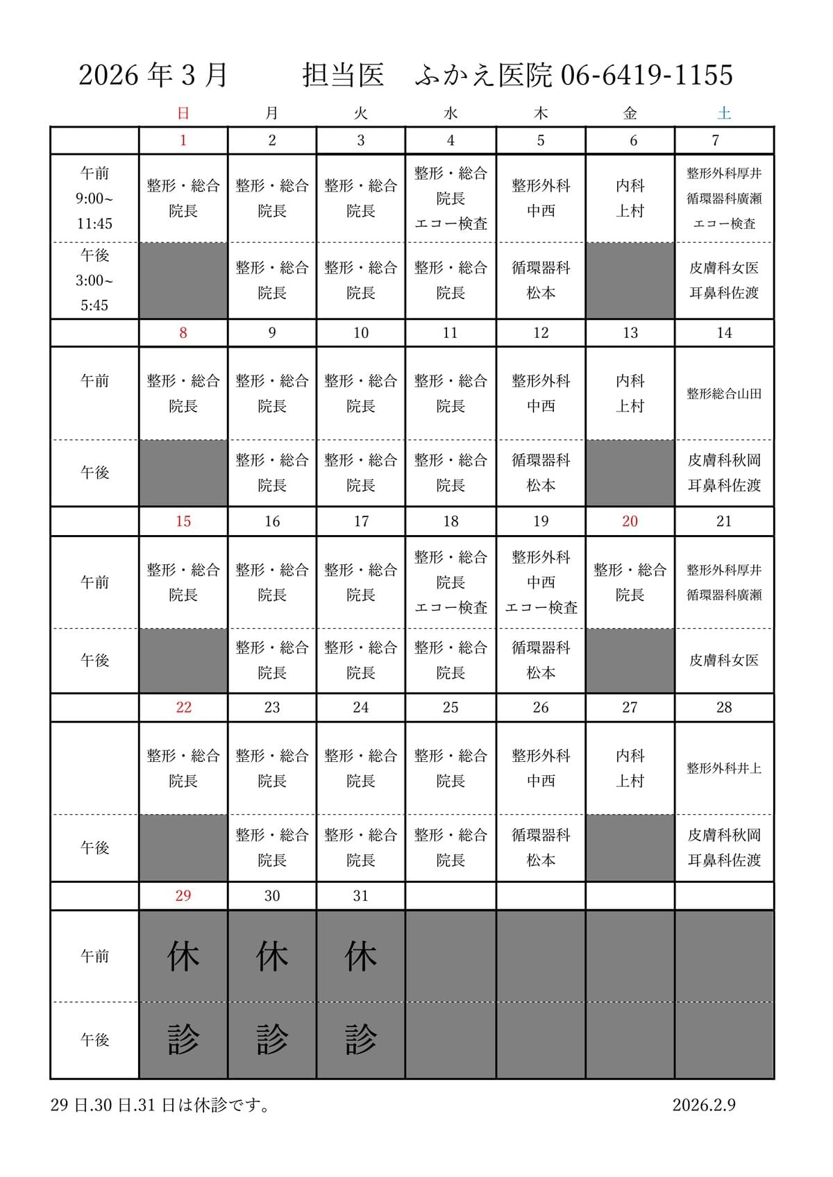 3月29日(日)~3月31日(火) 休診
